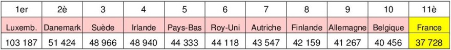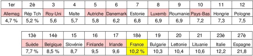 On constate dans le 1er tableau que tous les états de l’UE, situés au-dessus de l’Italie et dans l’ex- Europe de l’Ouest, dont les pays nordiques souvent pris en exemple au plan social, réussissent mieux que nous au plan du PIB par habitant. Le 2ème tableau nous montre qu’ils ont également tous un taux de chômage inférieur et souvent très inférieur au nôtre… avec les mêmes contraintes de l’UE.