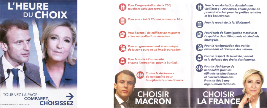Puisque sur celle de gauche est écrit « CHOISIR MACRON », sur celle de droite il devrait y avoir « CHOISIR LE PEN »… mais non, c’est « CHOISIR LA FRANCE ». Comme si les électeurs avaient le choix entre « Macron » et « la France » ?! Comme si choisir Macron c’était tourner le dos à la France. Absurde… mais évidemment manipulateur !