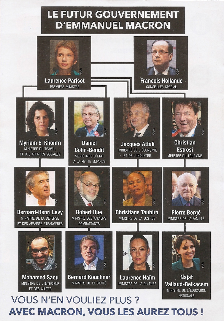 Le tract nous présente rien moins que « le futur gouvernement d’Emmanuel Macron » ! Laurence Parisot (ancienne présidente du Medef, la patronne des patrons), François Hollande, Christiane Taubira…