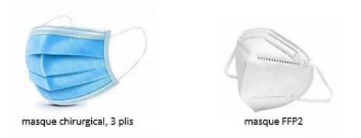 - Filtration insuffisante. « Le masque chirurgical type IIR : offre une efficacité de filtration bactérienne > 98% d'un aérosol de taille moyenne 3 µm » (source : inrs.fr) mais les particules virales de la Covid mesurent moins de 1 µm. Aujourd’hui encore, une recherche effectuée sur Internet de la forme « covid quel masque utiliser » conduit par exemple à ce qui suit. Sur LD Médical : « Seuls les masques de type FFP2 ou supérieur seront efficaces contre le risque de contagion ». Sur appuisante.fr un schéma indique que l’objectif du masque chirurgical est de « protéger les autres » alors que celui du FFP2 est de « se protéger ». Il apparaissait donc clairement que pour se protéger le masque chirurgical était jugé insuffisant.